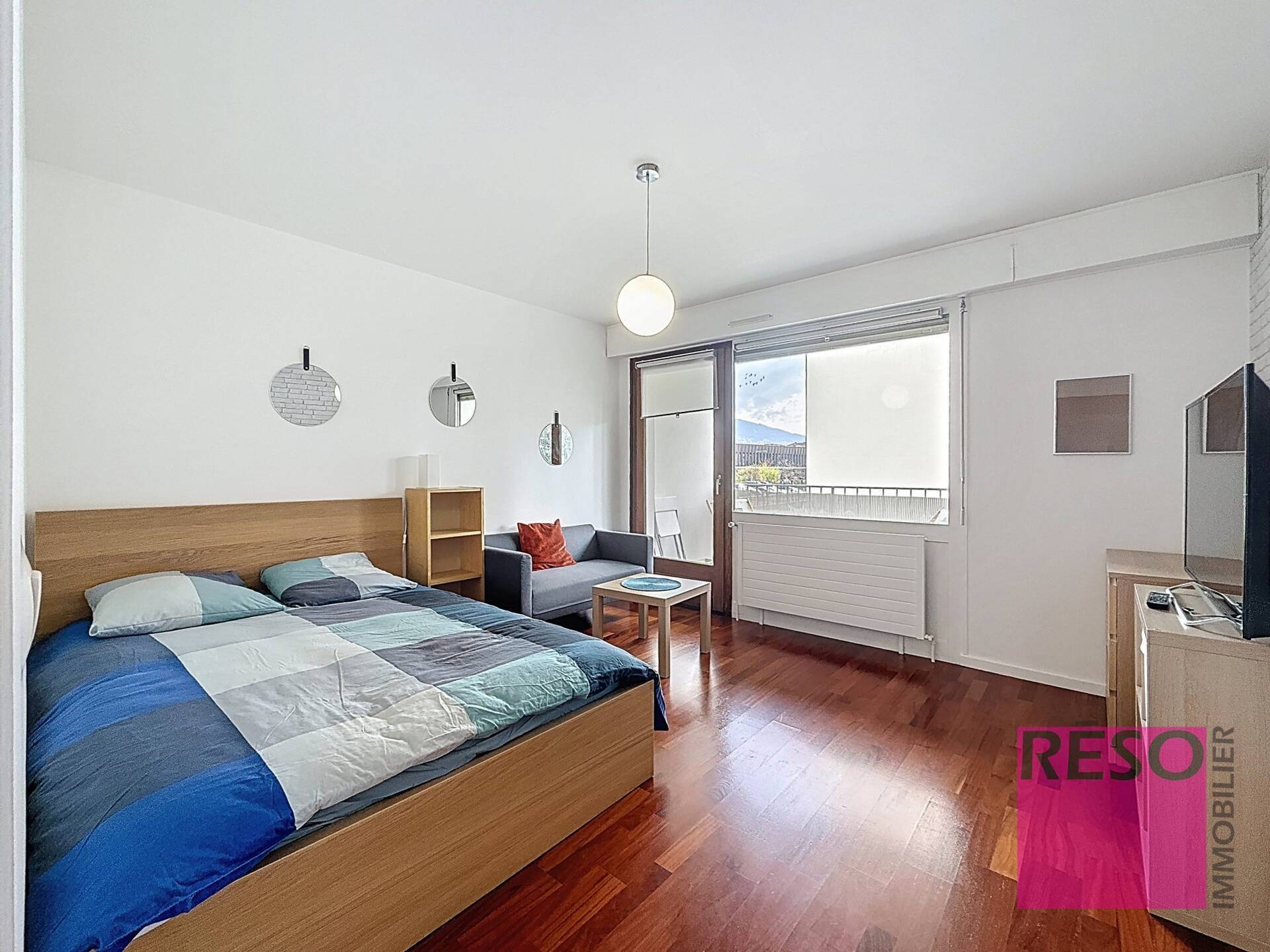 L'appartement offre un séjour lumineux de 14 m², aménagé avec un espace nuit (lit), un canapé, une télévision ainsi que des rangements fonctionnels, offrant un cadre de vie confortable et optimisé.