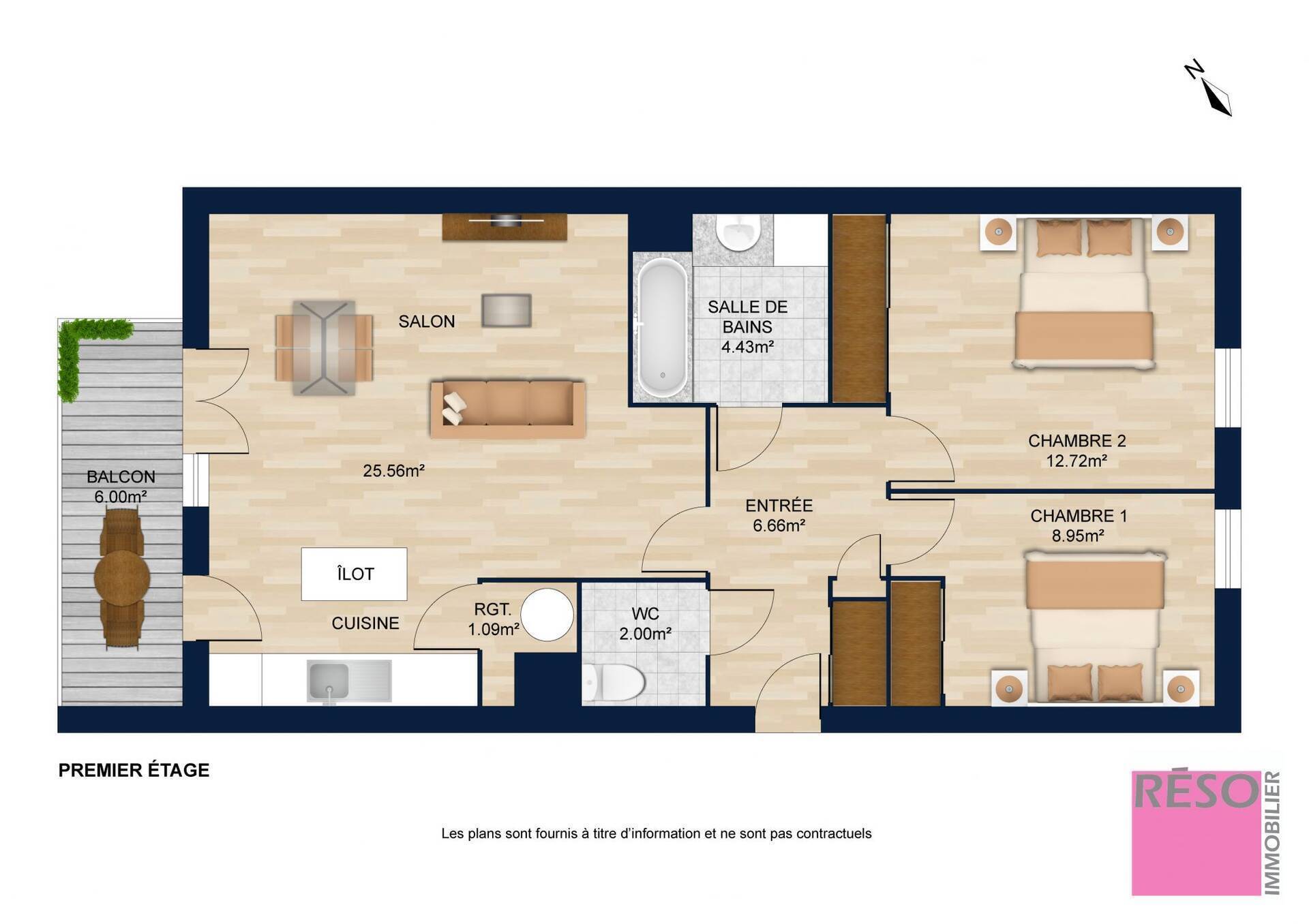 D'une surface d'environ 62m², il se compose d'une entrée avec rangement intégré, une pièce de vie ouverte sur une cuisine moderne et équipée, une salle de bain, un wc indépendant et un coin nuit comprenant deux chambres. Vous profiterez d'un balcon exposé ouest.